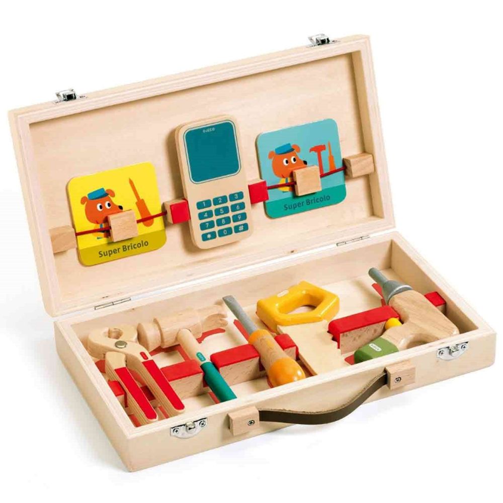 Kovček poln orodja iz Djeco je iz lesa.